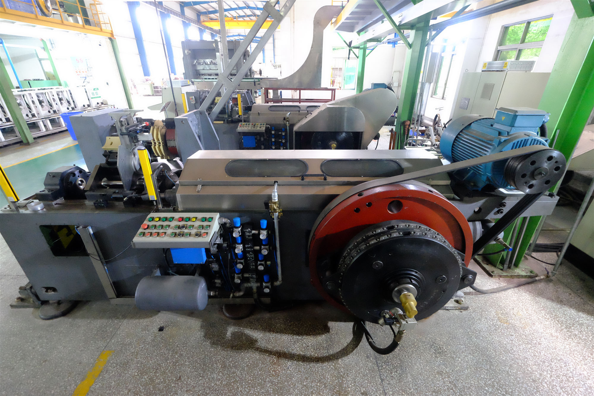 电机带动飞轮,通过离合器将动力传递至曲轴。在曲轴与安装在曲轴上面的凸轮的作用下使冲杆以及压